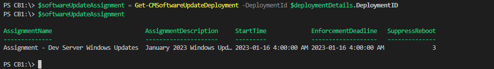 Next, we will get the assignment information for this deployment. Different deployment types use different cmdlets. Windows Updates are Feature Type “Software Update”, so use Get-CMSoftwareUpdateDeployment and provide the Deployment Id.