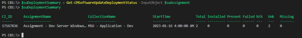 Once we have the assignment, we can use this information to get the deployment summary by using Get-CMSoftwareUpdateDeploymentStatus. This returns information for all of the software updates (configuration items) included in the assignment. If there are multiple configuration items included in the deployment, multiple objects will be returned.