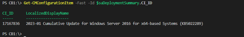 Get-CMConfigurationItem -Fast -Id $suDeploymentSummary.CI_ID